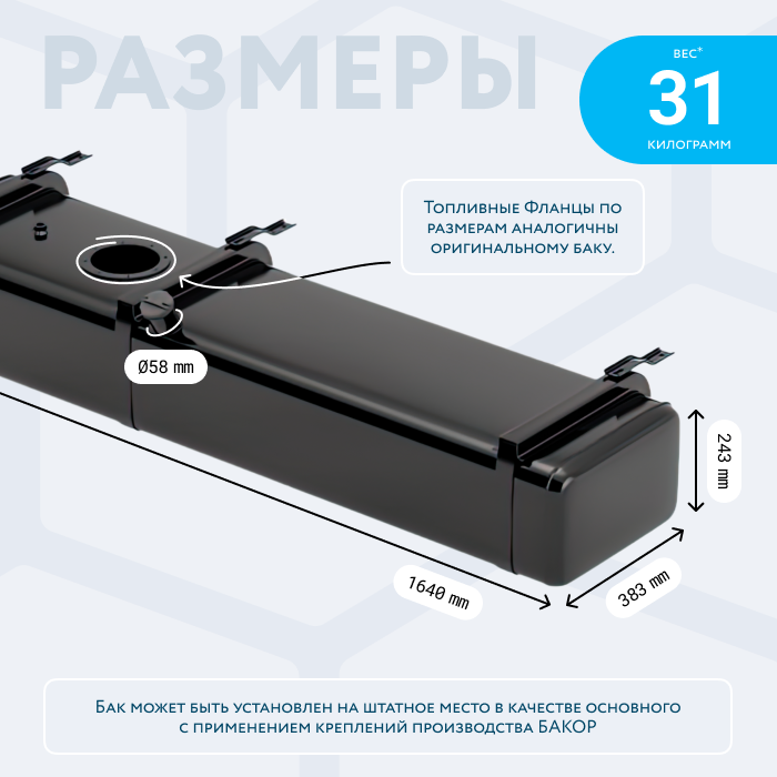 Топливный бак (аналог увеличенной ёмкости) предназначен для замены основного стального бака на а/м ГАЗ-3302 с инжекторным или дизельным двигателем, с удлиненной рамой.